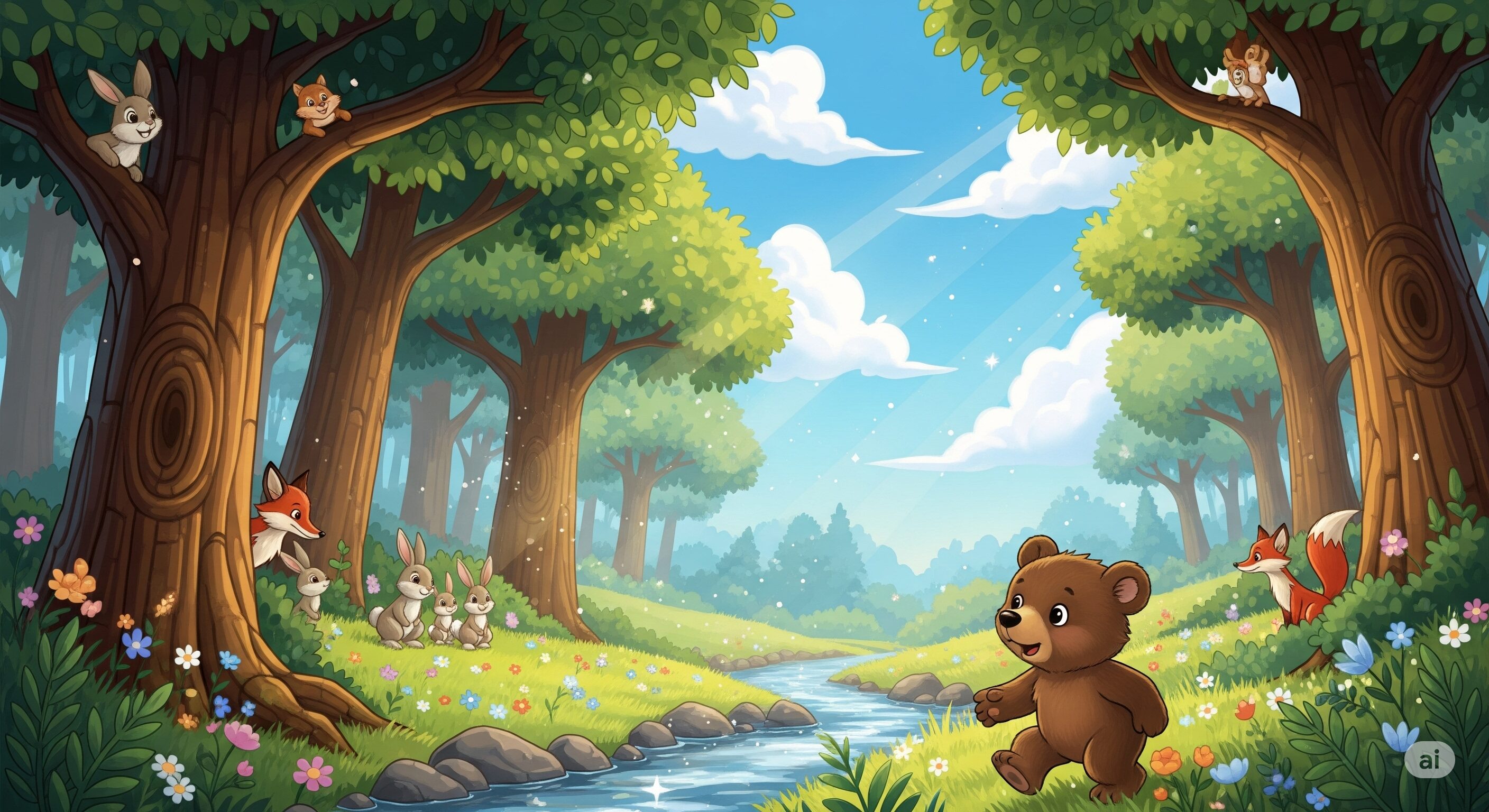 つぎに、リスさんのところへ。「リスさん、リスさん、キラキラのおほしさま、しらない?」 リスさんは、くるみをもぐもぐしながら、「うーん、ぼくも知らないよ。でも、もりのなかには、ふしぎなものがたくさんあるから、もっと奥に行ってみたら?」