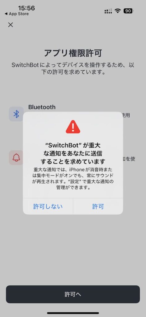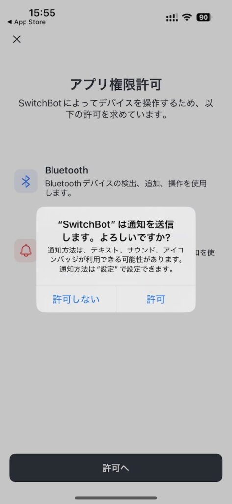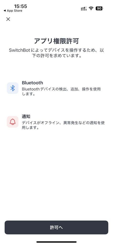 アプリを起動すると、「アプリの権限許可」としてBluetoothや通知の許可が求められることがあります。