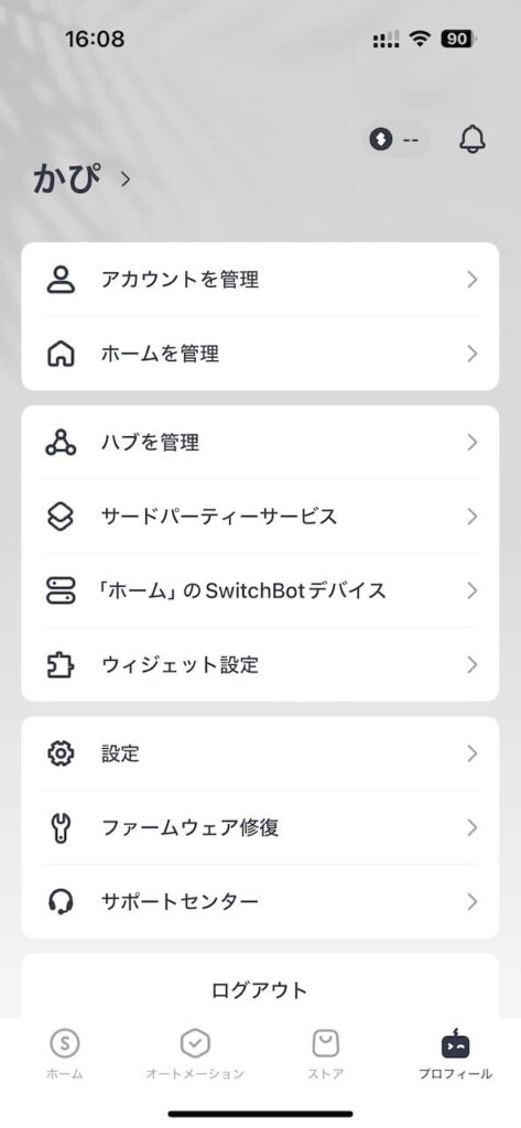 「プロフィール」画面や「ホーム」画面が表示されれば、SwitchBotのアカウント作成は完了です。
