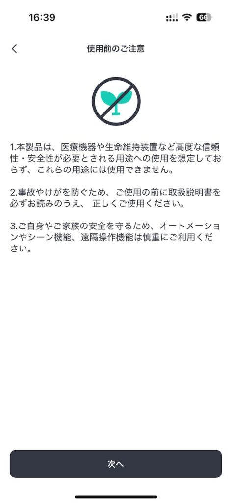 ・「使用前のご注意」の内容を確認し、「次へ」を選択