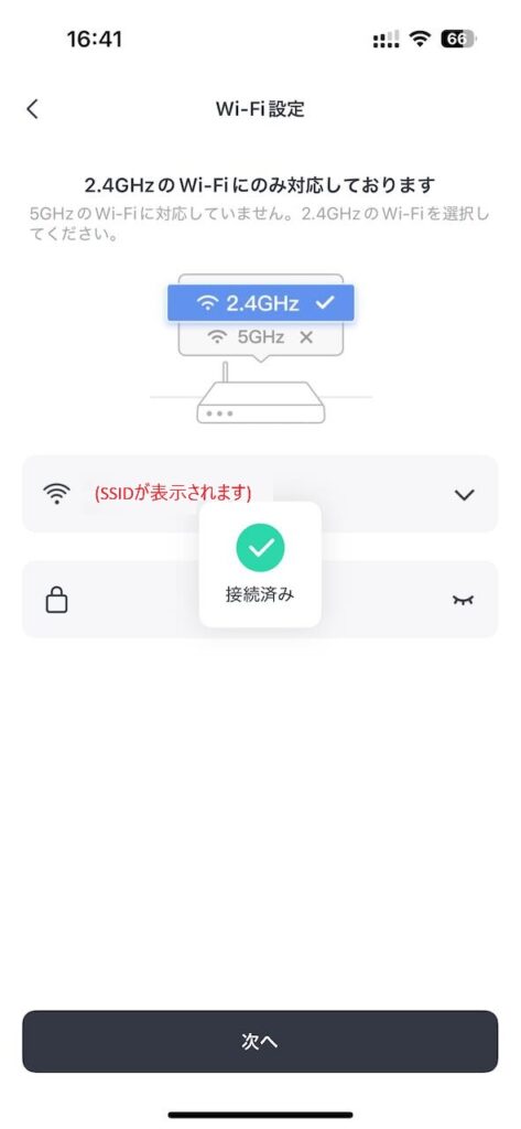 ・本体左上の表示ランプが高速で点滅したら、アプリに戻り「次へ」をタップ