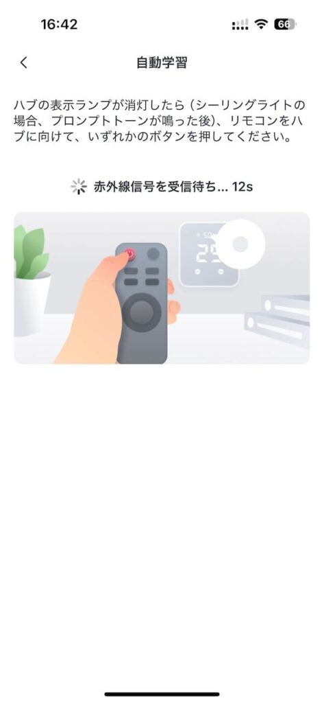 エアコンのリモコンをSwitchBot ハブ2本体に近付け、何かボタンを押す