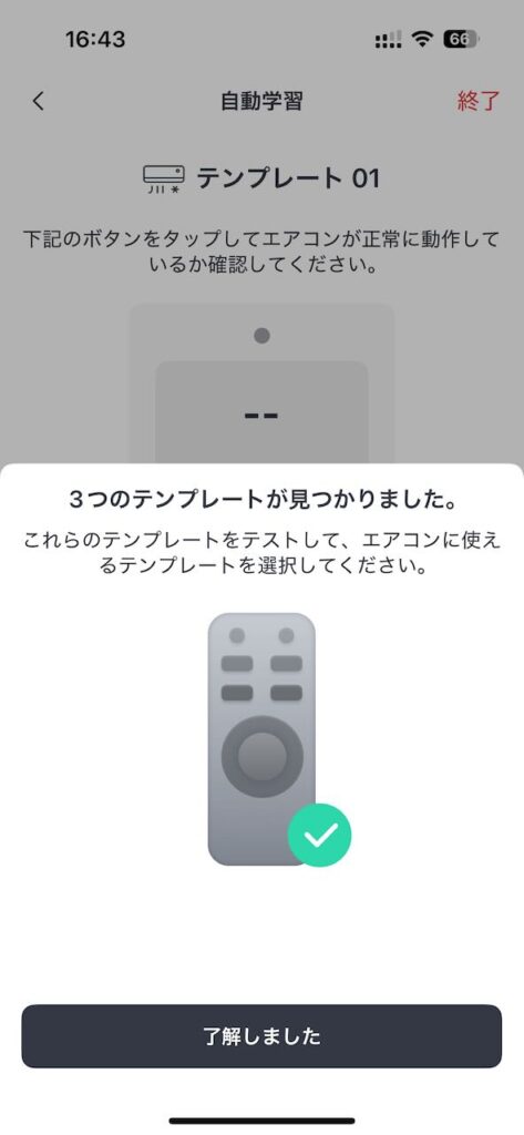 赤外線信号の受信が正常にできると、「テンプレートが見つかりました」という画面が表示されます。