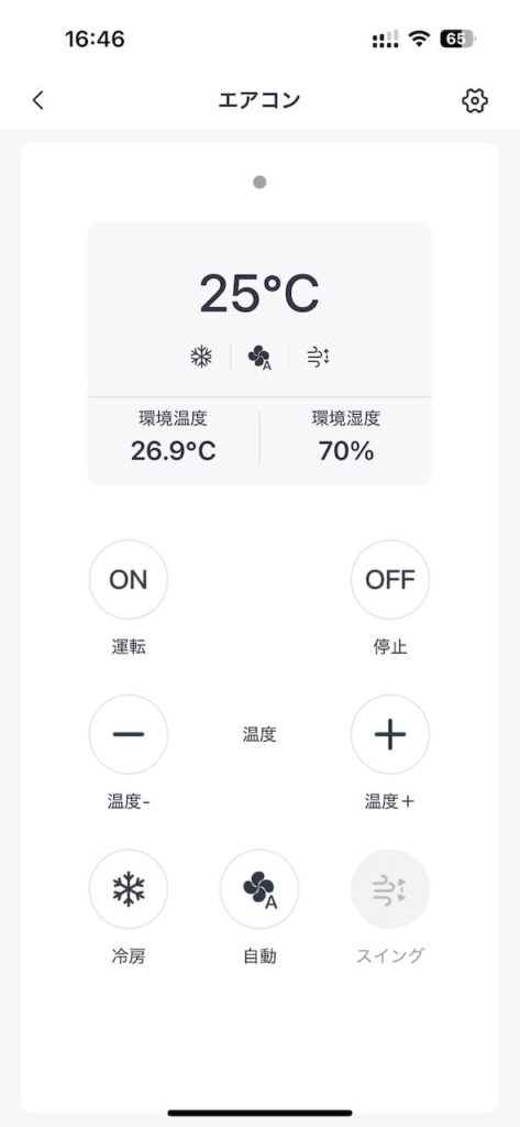 ホームメニュー画面から先程登録したエアコンを選択、電源ボタンや冷房・除湿・暖房ボタン、風量ボタンを押す